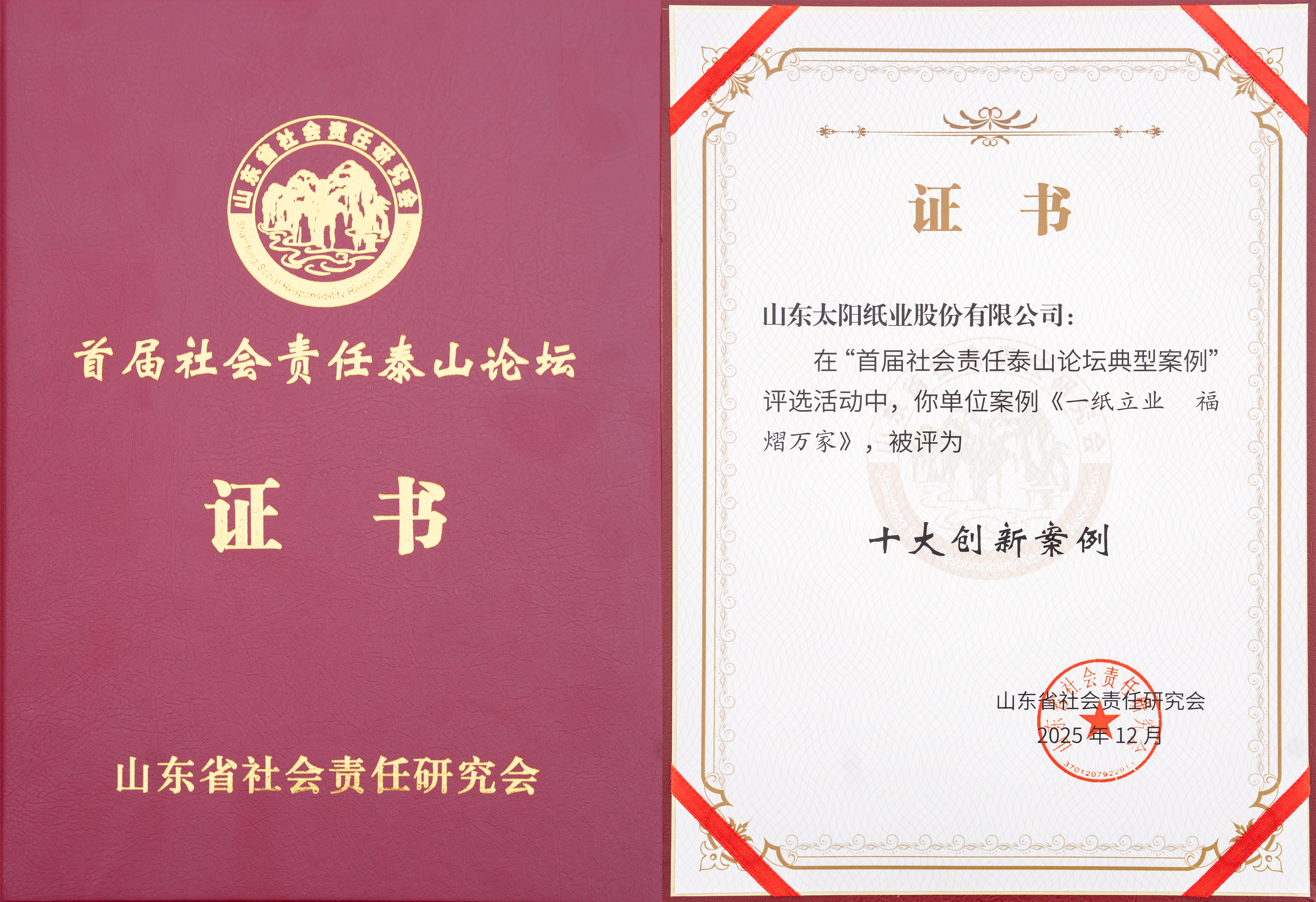 12月20日,,,,由山东省社会责任研究会主办的首届社会责任泰山论坛在济南举行。。。。论坛期间,,公司报送的《一纸立业 福熠万家》社会责任实践案例,,从全省众多优秀案例中脱颖而出,,荣获首届社会责任泰山论坛“十大创新案例”。。据了解,,山东省社会责任研究会面向全省企业公开征集首届社会责任泰山论坛典型案例,,,经过企业自主申报、、、资格审查、、、、专家评审等严格程序,,,,最终评选产生“十大引领案例”“十大示范案例”“十大创新案例”及24个